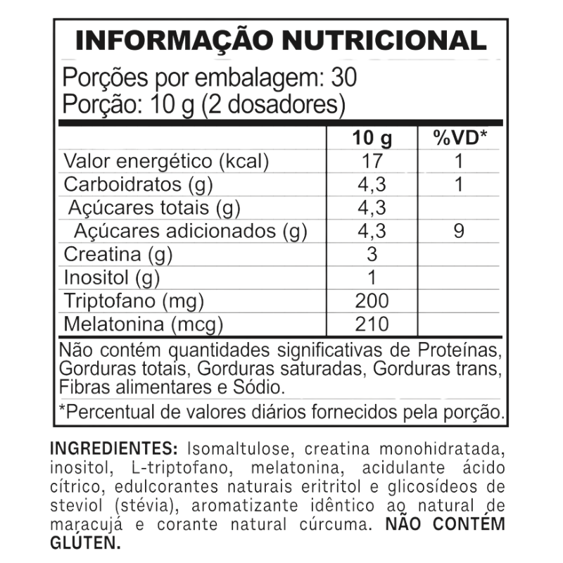 Fórmula que combina creatina, triptofano e melatonina, desenvolvida para integrar seu ritual noturno de relaxamento, sono e recuperação, com um maravilhoso sabor leve de macarujá.